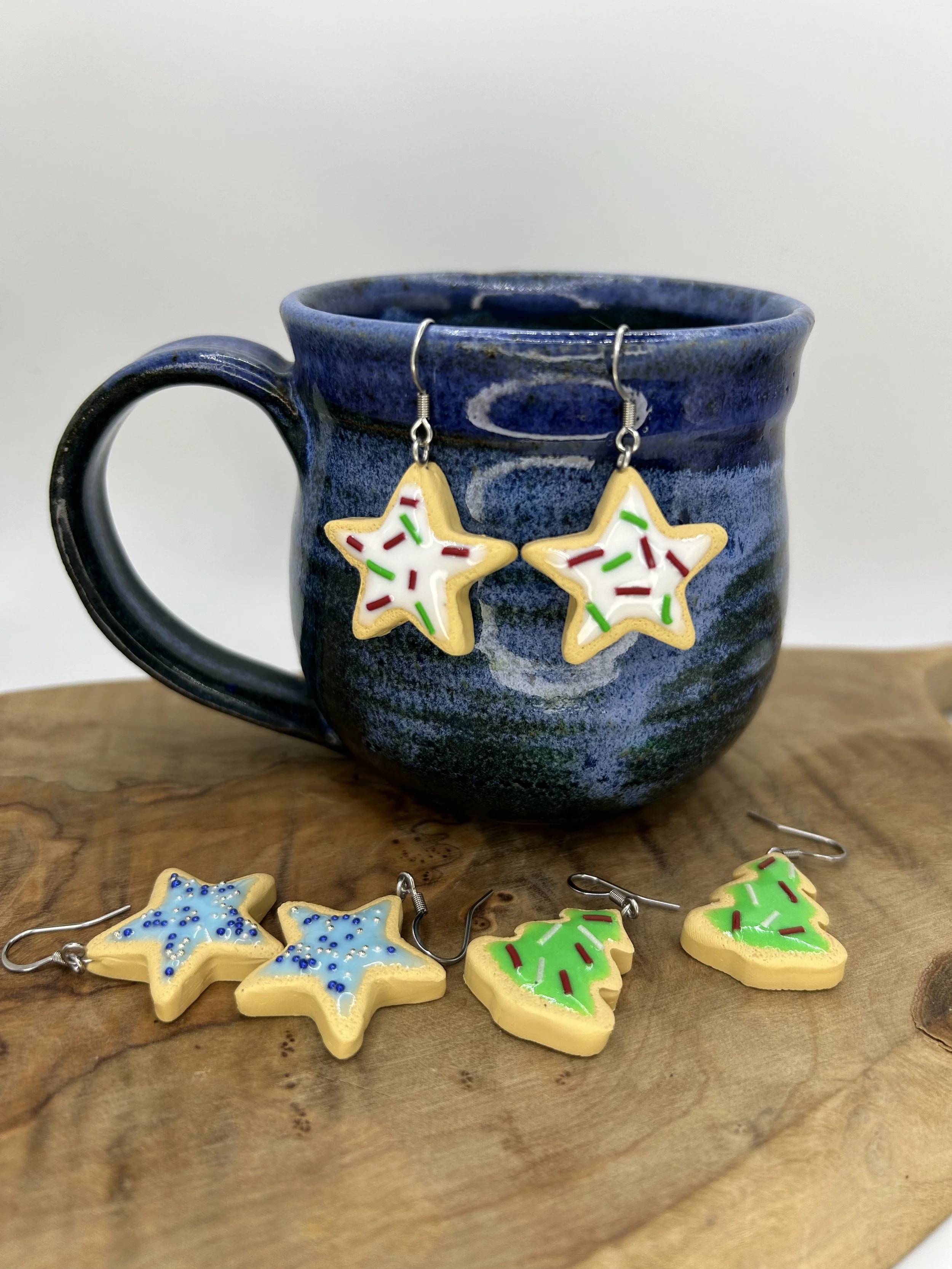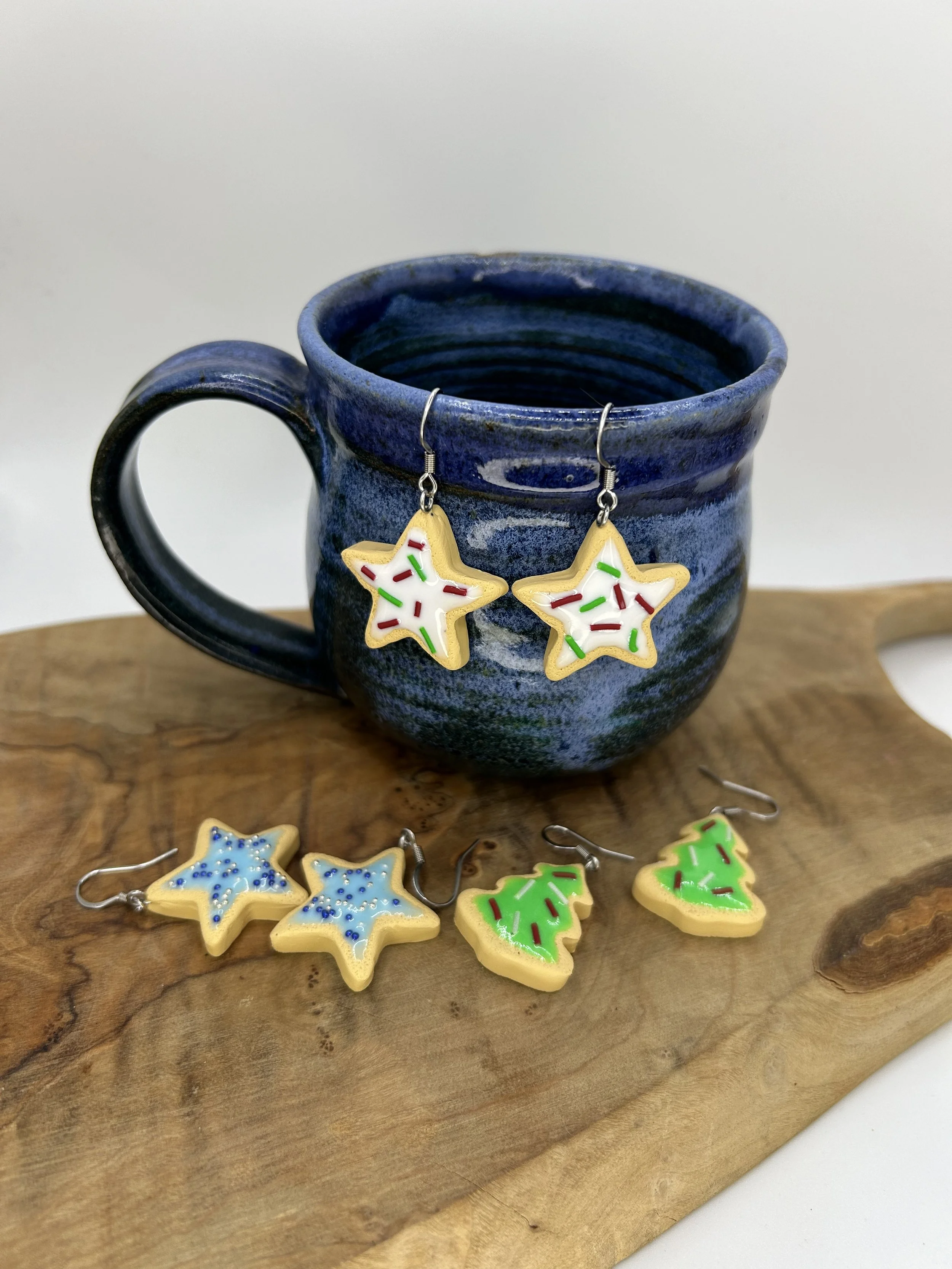 These frosted sugar cookies are hand made out of polymer clay and the frosting is resin, dyed in small batches. All hooks are hypoallergenic stainless steel, ideal for sensitive ears! Christmas star cookies are white frosted with red and green sprinkles.
